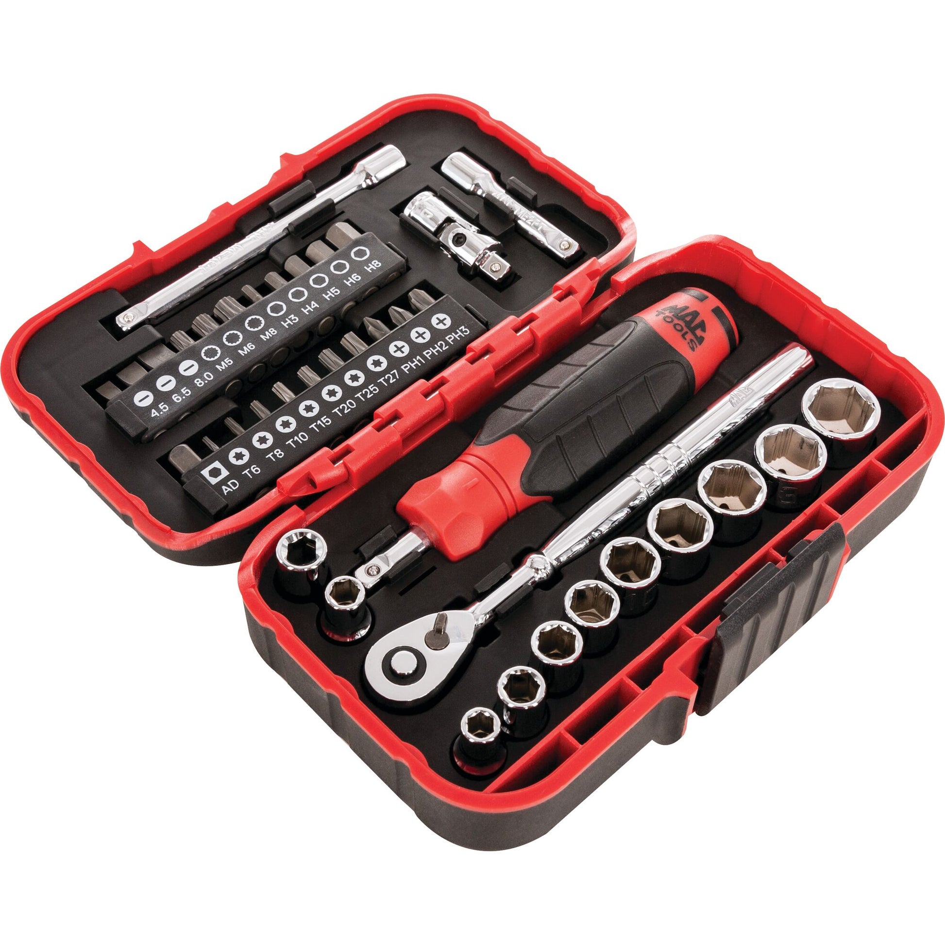 - 1/4-inch Drive Spin Handle; 1/4-inch Hex Drive Bit Ratchet; 1/4-inch Extension 2-inch and 4-inch; 1/4-inch Universal Joint; Slotted Bit 3/16-inch, 1/4-inch, 9/32-inch; Phillips Bit #1, #2, #3; Hex Bit 1/8-inch, 5/32-inch, 3/16-inch, 7/32-inch, 1/4-inch; Male X 1/4-inch Square Male Adapter 1-inch; Female x 1/4-inch Square Female Bit Coupler; TORX T8, T10, T15, T20, T25, T27; Spline M5, M6, M8; Non-Slip 6-PT Socket 5/32-inch, 3/16’, 7/32-inch, 1/4-inch, 9/32-inch, 5/16-inch, 11/32-inch, 3/8-inch, 7/16-inch, 1/2-inch